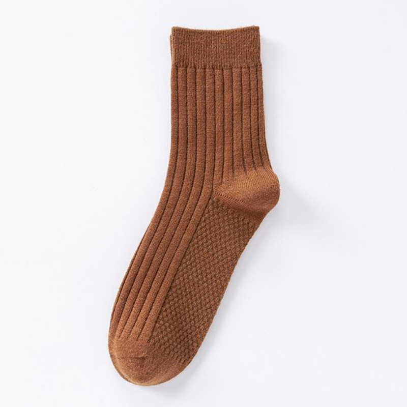 Len là một sợi protein động vật tự nhiên và thân thiện với môi trường, tinh tế và mềm mại, với hiệu ứng cách nhiệt. Sợi len mịn và mịn, và khi được dệt thành vớ, nó ấm áp, chắc chắn, thoải mái và chống mòn. Len cũng có độ hấp thụ ẩm và hơi thở tốt, có thể hấp thụ độ ẩm và mồ hôi từ bàn chân một cách hiệu quả, giữ cho chúng khô. Một số sản phẩm sử dụng vải đàn hồi len và polyester composite, kết hợp sự ấm áp của len và độ co giãn của sợi polyester để cải thiện sự thoải mái khi mặc. Chiều dài của vớ ống giữa có thể bao phủ con bê, tăng phạm vi ấm áp và ngăn chặn sự xâm nhập của gió lạnh, đặc biệt phù hợp để mặc vào mùa thu và mùa đông. Thiết kế đàn hồi của miệng và cơ thể có thể tự do điều chỉnh độ kín để thích nghi với hình dạng bàn chân của mọi người và nhu cầu mặc. Nó sẽ không siết chặt mắt cá chân hoặc nới lỏng khi đeo, và độ mềm của len làm cho đôi tất cảm thấy thoải mái khi tiếp xúc với da, mà không bị kích thích. Sự hấp thụ độ ẩm và hiệu suất hút mồ hôi của len có thể giữ cho bàn chân khô ráo và làm giảm sự phát triển của vi khuẩn. Để ngăn chặn mùi chân.